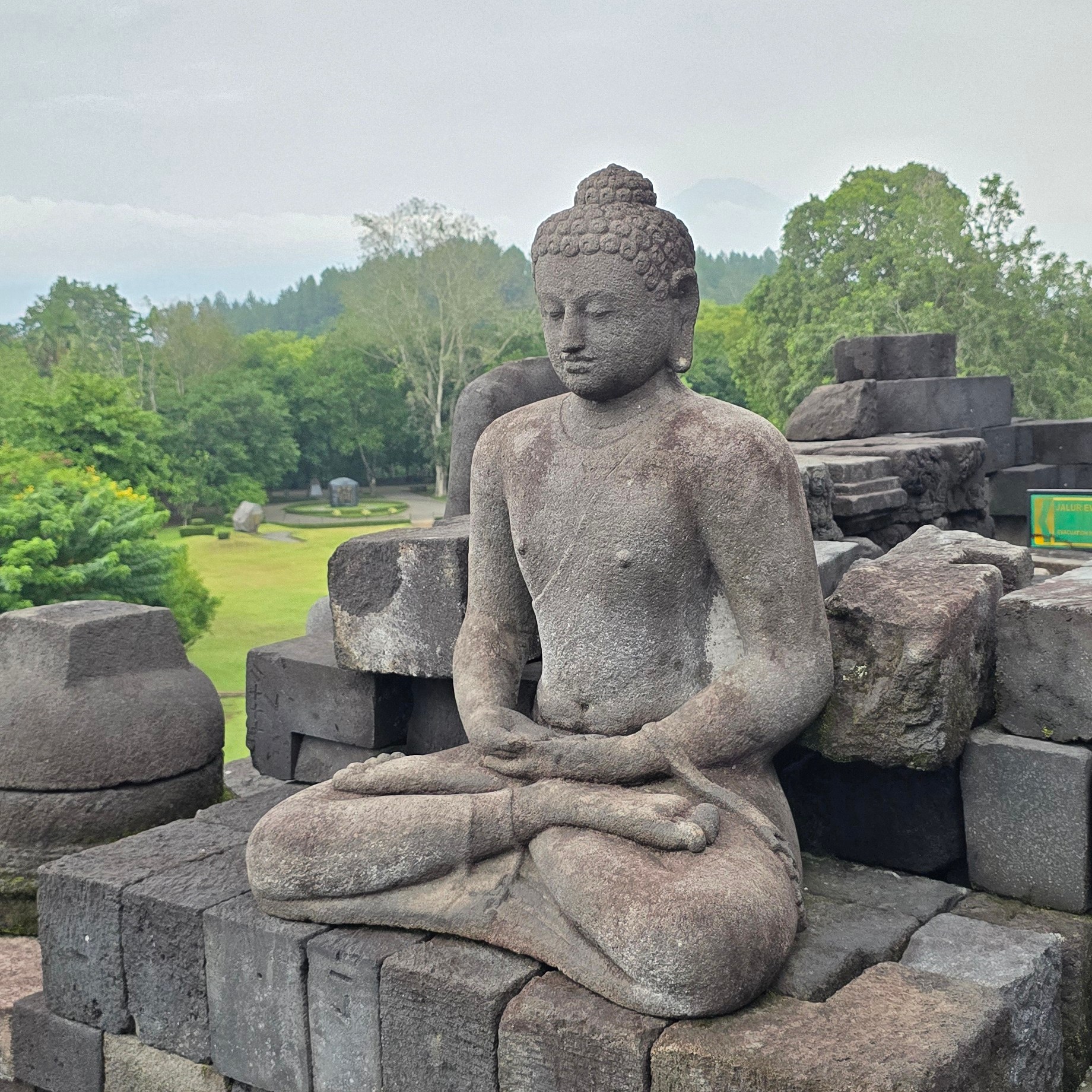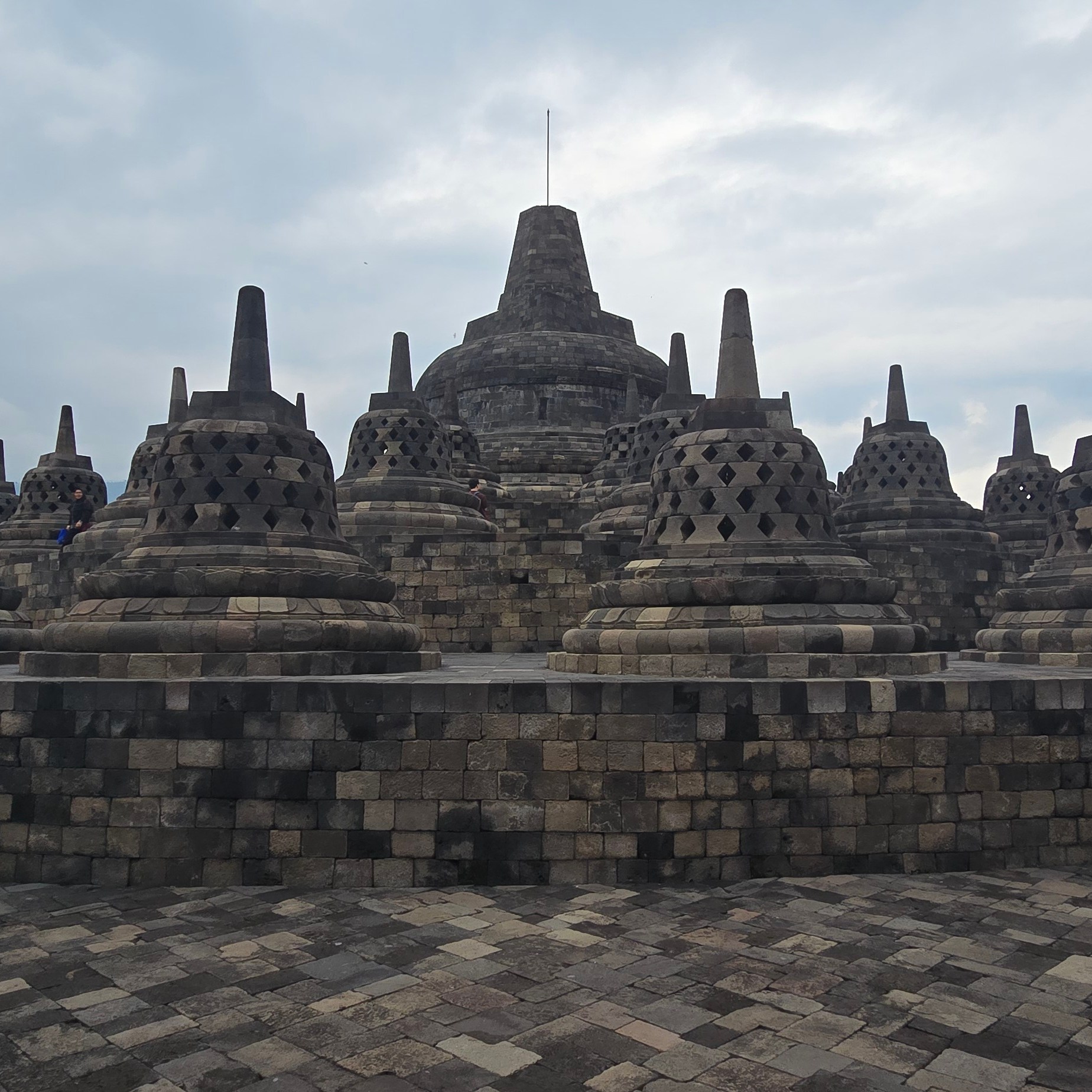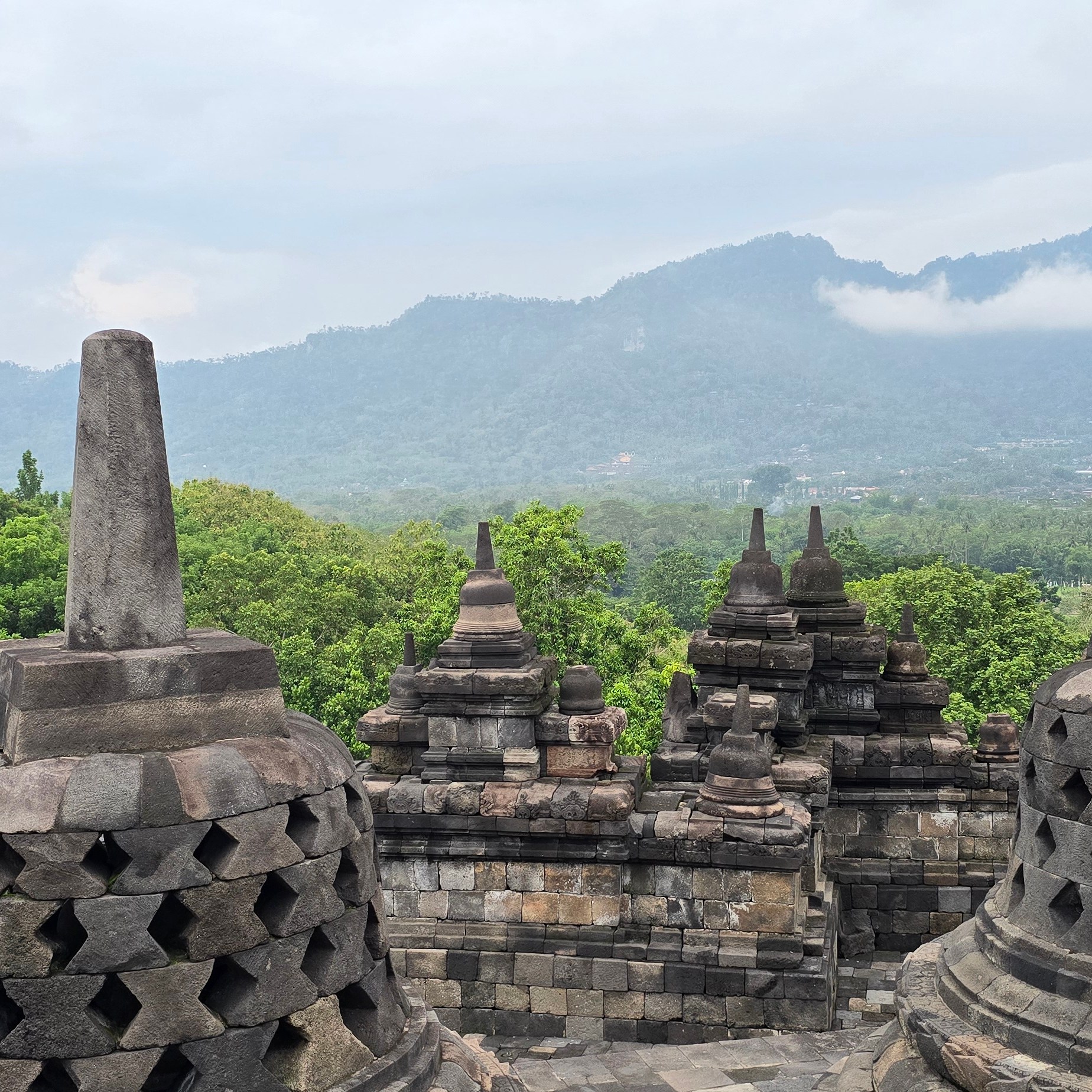 Met weer een hele culturele ervaring erbij in mijn rugzak, reisden we daarna dan eindelijk door naar Borobodur. Na een lange rit in de richting van Magelang, werd ik door een tourgids door de Boeddhisten tempel rondgeleid. Hij vertelde alles over de tempel, de rituelen van de monniken, het Boeddhisme en alle beeldspraak die in de tempel te zien was. De beeldspraak die het verhaal van het Boeddhisme vertelt. Ik merkte dat ik hier veel herkenning vond. Niet alles sprak me aan. Maar mijn visie op het spirituele komt wel het meest overeen met de Boeddhistische religie. De stoepa telt negen etages. De onderste zes zijn vierkant end e bovenste drie zijn rond. De etages vertegenwoordigen de Boeddhistische kosmos. Iedere etage hoger wordt pas toegankelijk op moment dat je de levenservaringen en spirituele wijsheid van de vorige etage beheerst. Als toerist mag je alle etages (buiten) bezoeken. Behalve de negende, die is enkel en alleen toegankelijk voor de verlichten op het hoogst spirituele niveau. Op de achtste etage genoot ik van een prachtig uitzicht over het landschap waar Borobodur zich in bevind. Het zicht op de verschillende bergen die het omringen bracht een sereen gevoel. Daar heb ik nog enige tijd mindfull zitten mediteren voordat we onze weg terug naar beneden maakten.