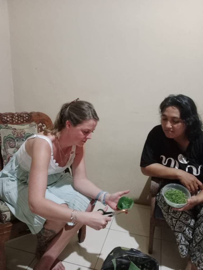 Inek leerde mij een ceremonieel bloemenbakje maken van bananenblad met vijf soorten bloemen. Dit staat symbool voor je eigen hele wezen. Het bakje wordt gevouwen van bananenblad en vervolgens in een ronde vorm geknipt. Dit symboliseert je hele zelf, de cirkel staat voor de oneindigheid. De vijf soorten bloemen die we in het bakje legden staan ieder symbool voor één van de elementen: vader licht, moeder aarde, vuur, water en je eigen essentie. Ik moest twee van deze bakjes maken. Één om bij een boom in de tuin van Inek en Wiwied te plaatsen en één om mee te nemen naar de heilige bron Sendang Kasihan. Zo gezegd, zo gedaan.